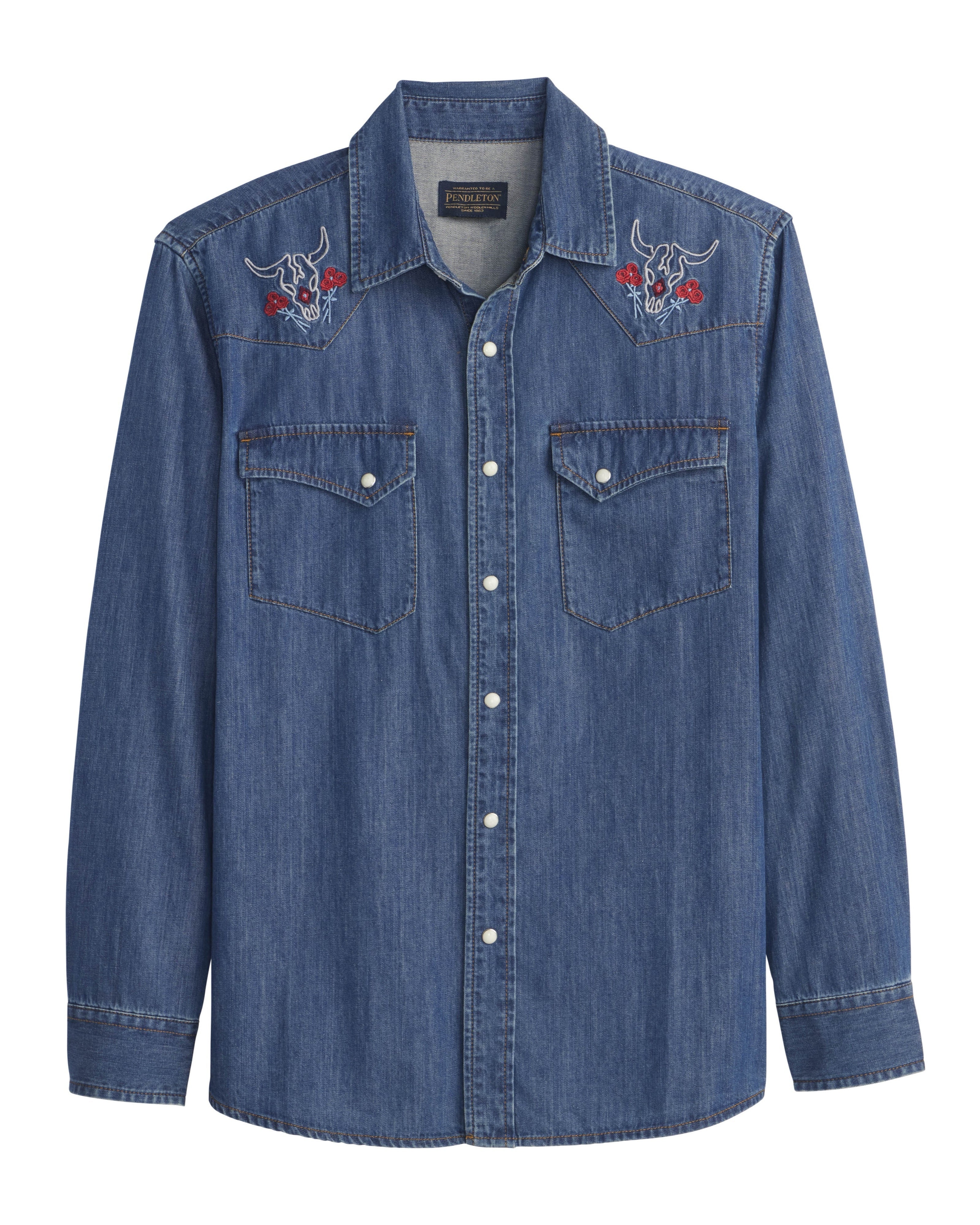 This boxy-fit Tencel shirt boasts embroidered cowgirl motifs inspired by a novelty '50s-'60s tablecloth, blending retro charm with modern style.