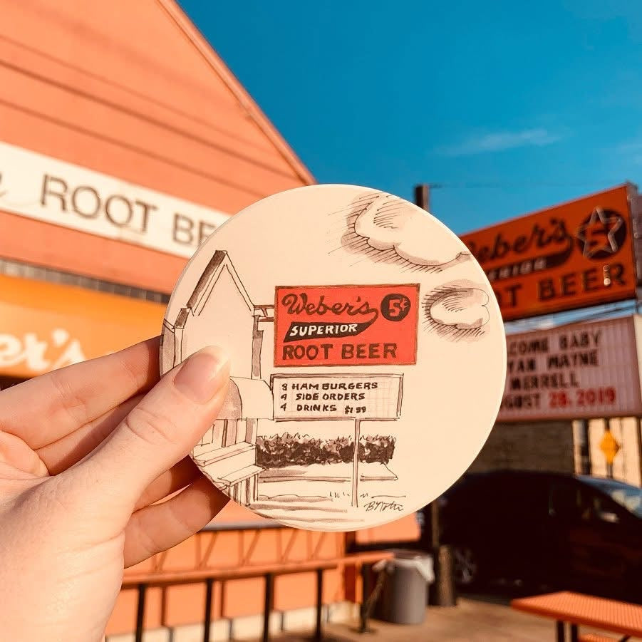 Known for its old-fashioned root beer and classic griddle-cooked burgers since 1933, Weber’s is an Oklahoma institution — and this coaster brings that hometown charm right to your tabletop. Great for gifting or collecting, it’s a perfect slice of Tulsa pop culture.