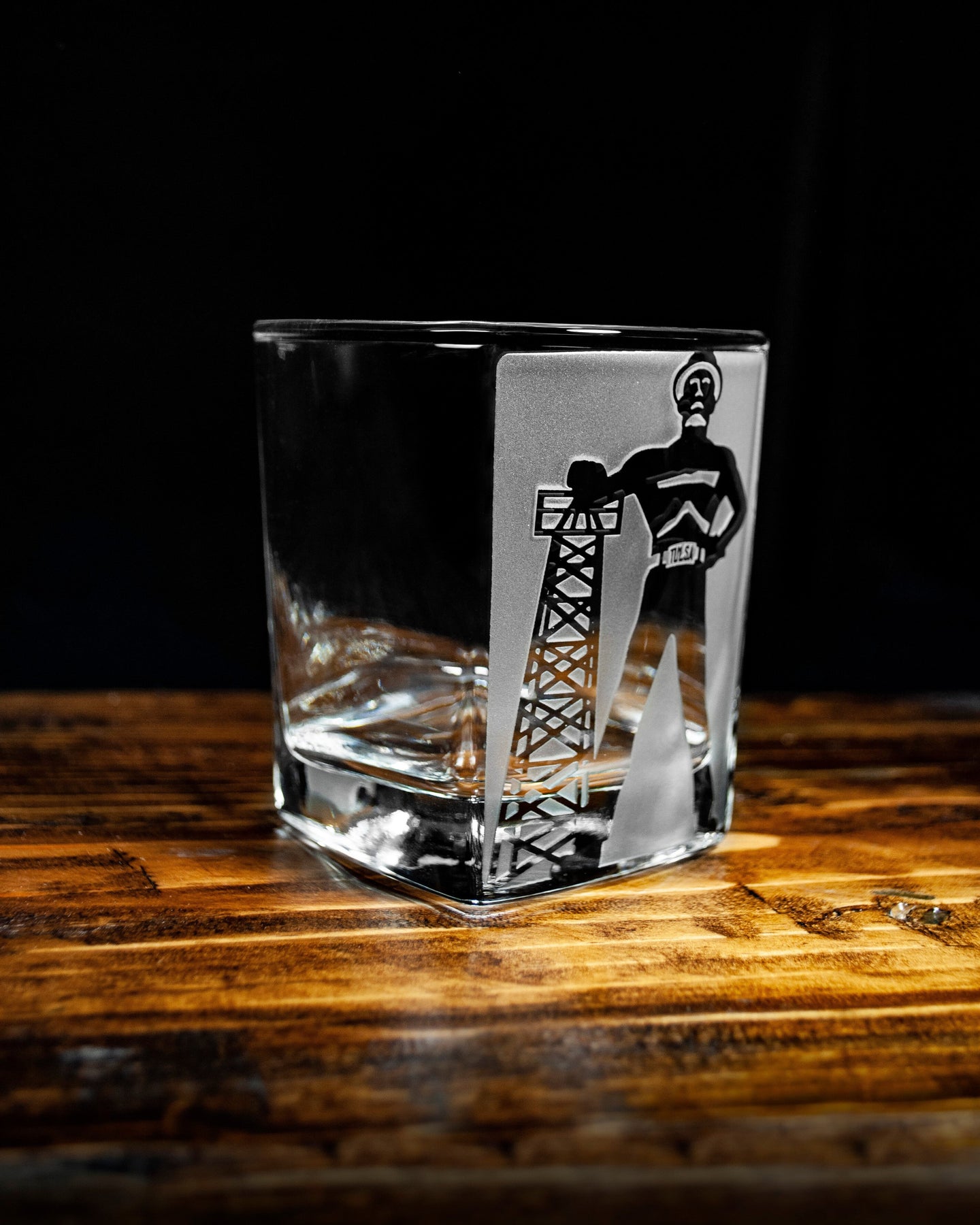 The Golden Driller Square Rocks Glass is deeply sand-etched, creating this famous local landmark in the negative space left behind. His belt buckle proudly reads “Tulsa,” just like the real 75' statue that you love. Each glass is individually prepared and engraved one at a time by skilled artisans for crisp lines and fine detail.