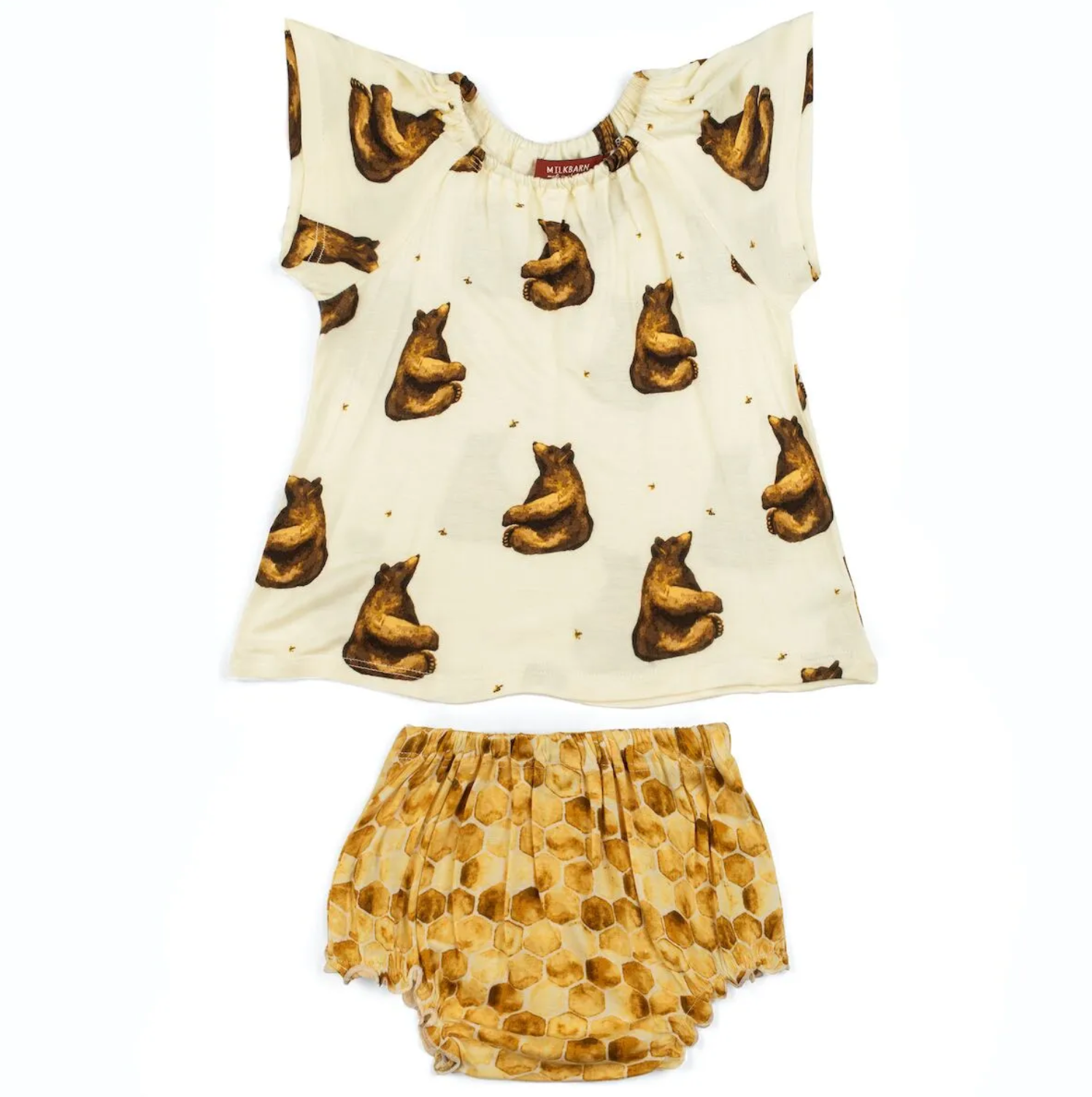 We encourage our little ones to cuddle, crawl, skip and twirl. And to do so while wearing our free-form, whimsical organic cotton Dress & Bloomer Set in the watercolor Chicken print. We paired the relaxed silhouette with coordinating, ruffle leg bloomers. The elastic crew neckline, waist, and leg openings allow for ease of dressing and movement.
