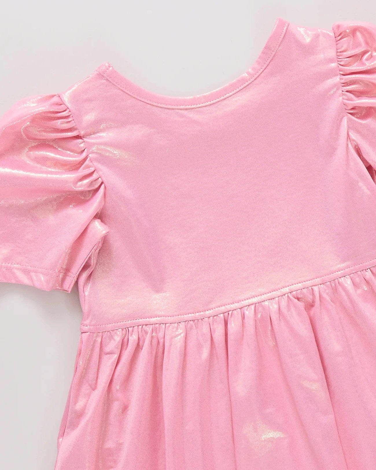 Sweet, shiny, and made to twirl! This light pink lamé dress brings soft glamour to everyday dressing with puff sleeves and a comfortable gathered skirt that moves beautifully with every step.