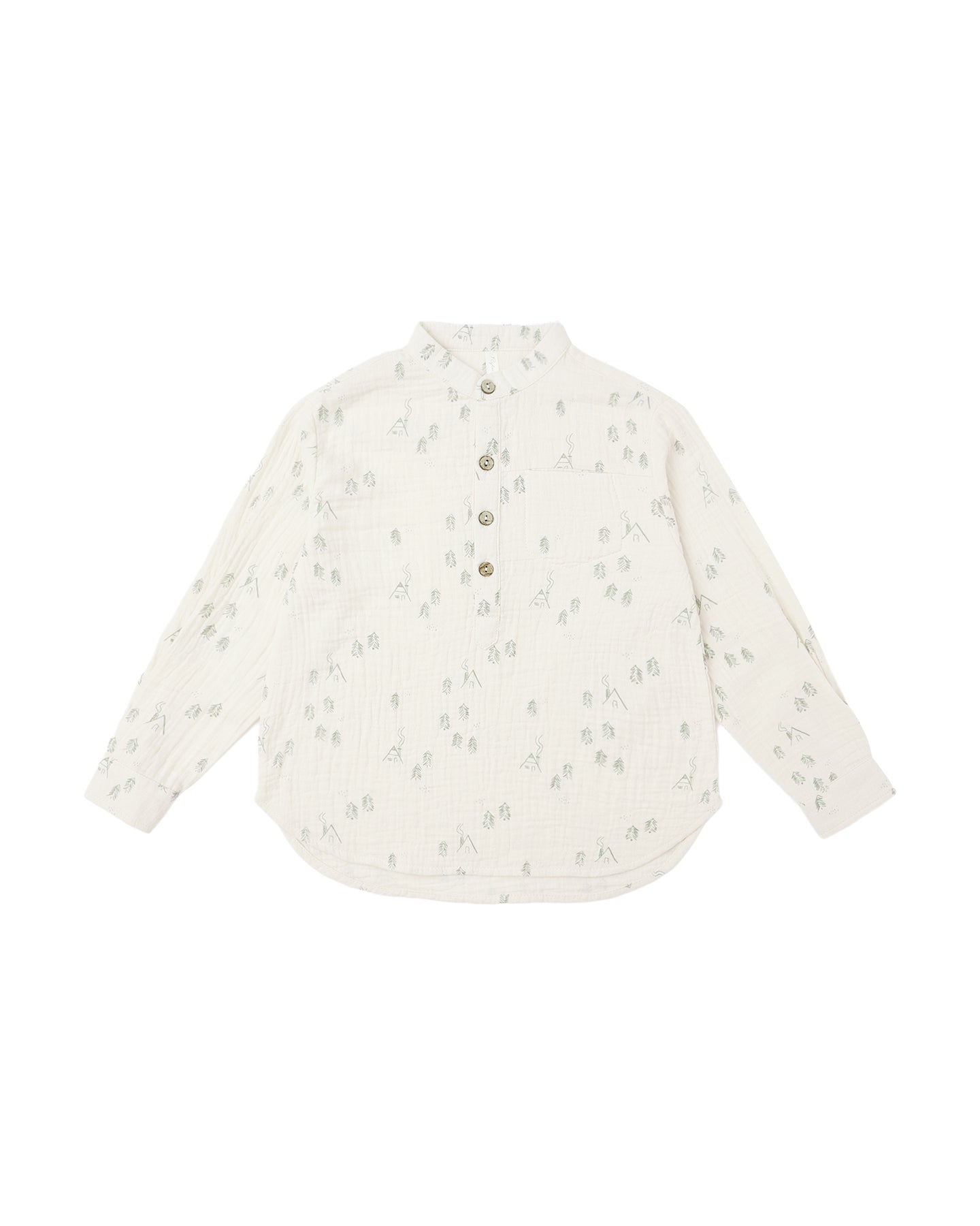 Our Long Sleeve Mason Shirt features a mandarin collar, chest pocket, and coconut buttons along the front placket for a clean, modern look.