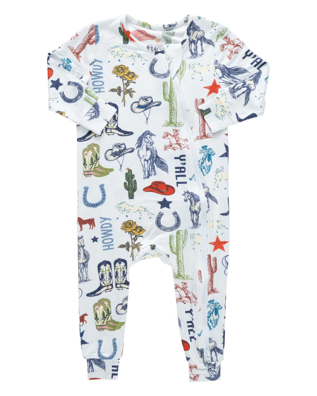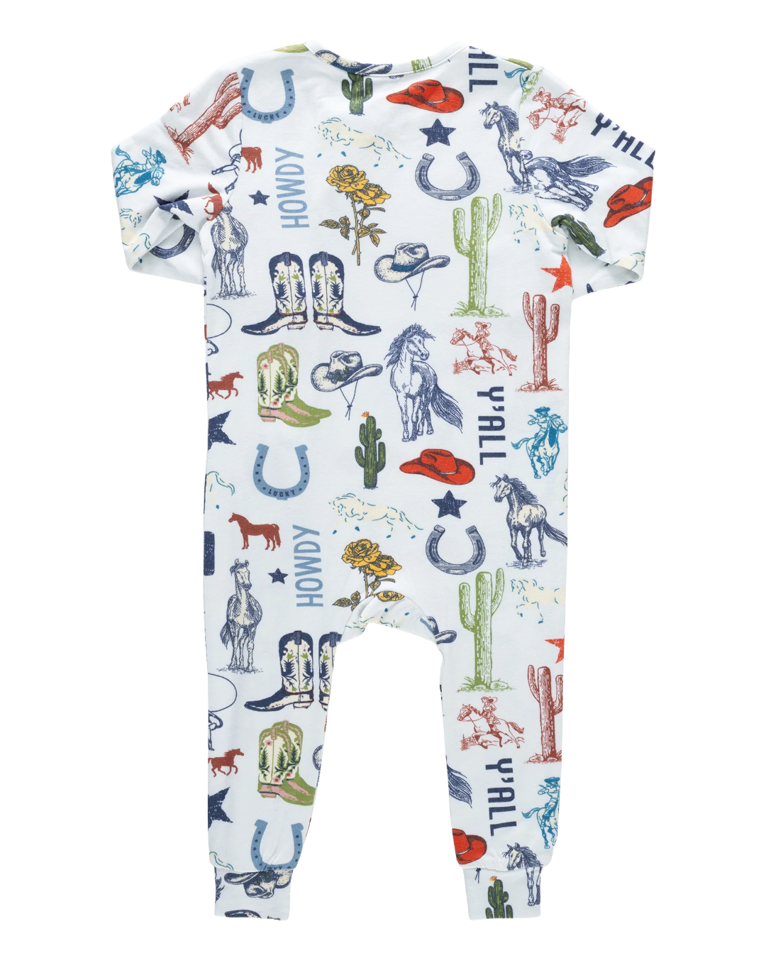 Saddle up for soft snuggles! Our Baby Bamboo Romper features our playful Western Dreams print, filled with charming cowboy-inspired icons for a little western whimsy.