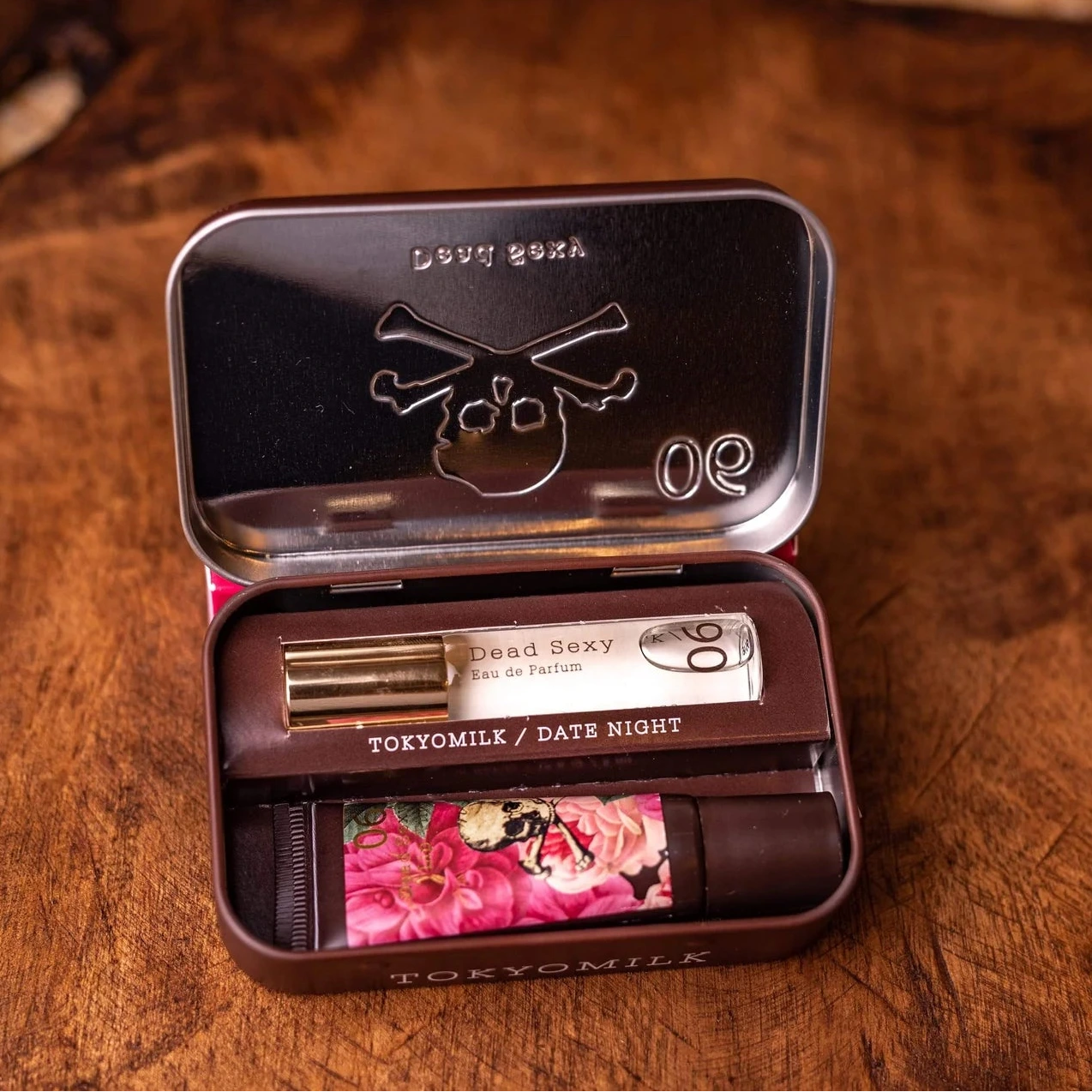 A perfect on-the-go date night prep kit including a luscious Citrus Rose Lip Tint and a Dead Sexy Mini Rollerball Eau de Parfum inside a keepsake tin.