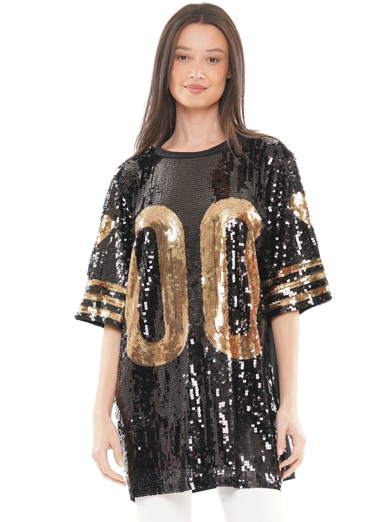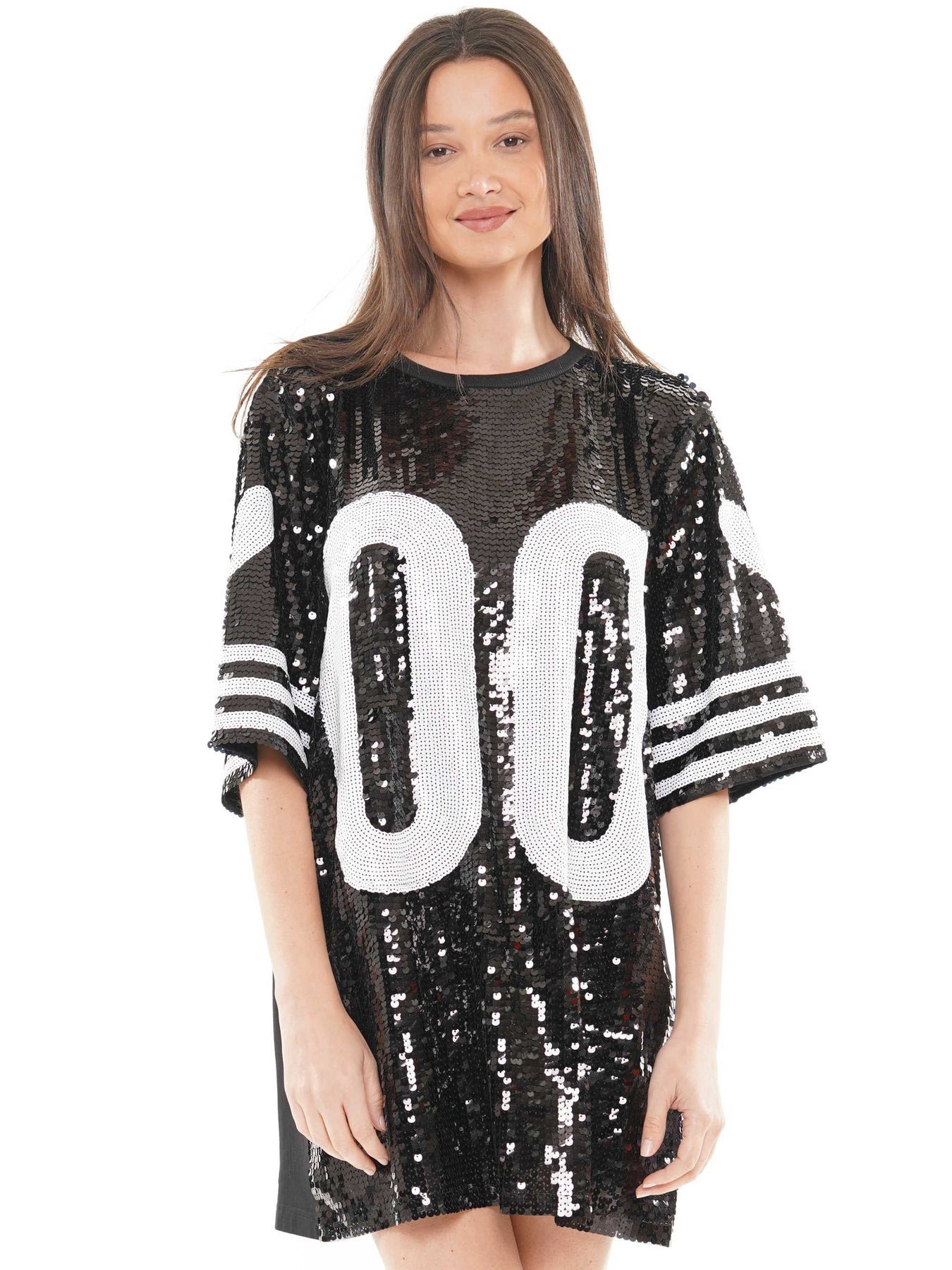 This stylish Double Sequin Dress is perfect for game day! Crafted in sequin fabric, it features a unique 00 print that will make you stand out from the crowd. With its sophisticated silhouette, this dress is sure to be a fan favorite.