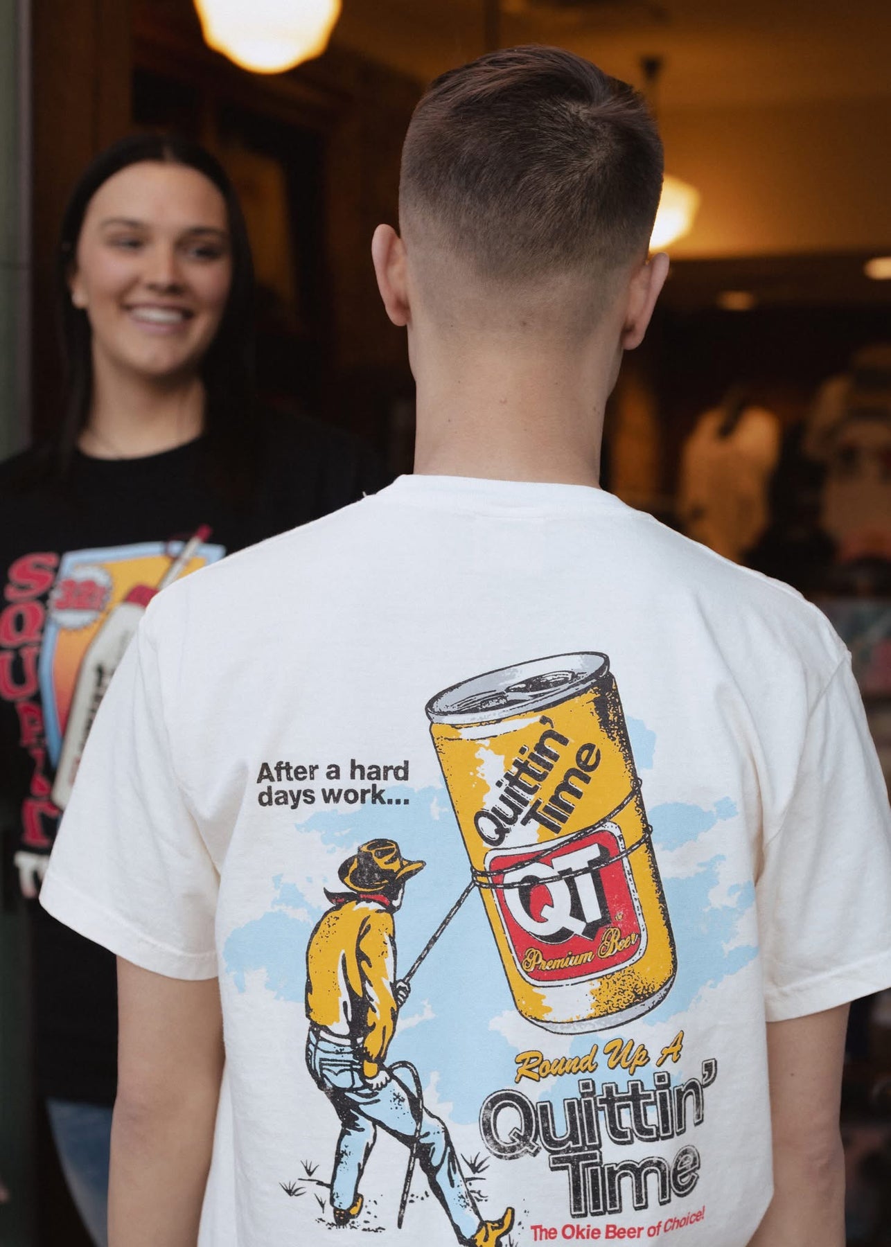 Retro QuikTrip collaboration shirt with fishing scene and quitting time beer design, nostalgic Oklahoma apparel.