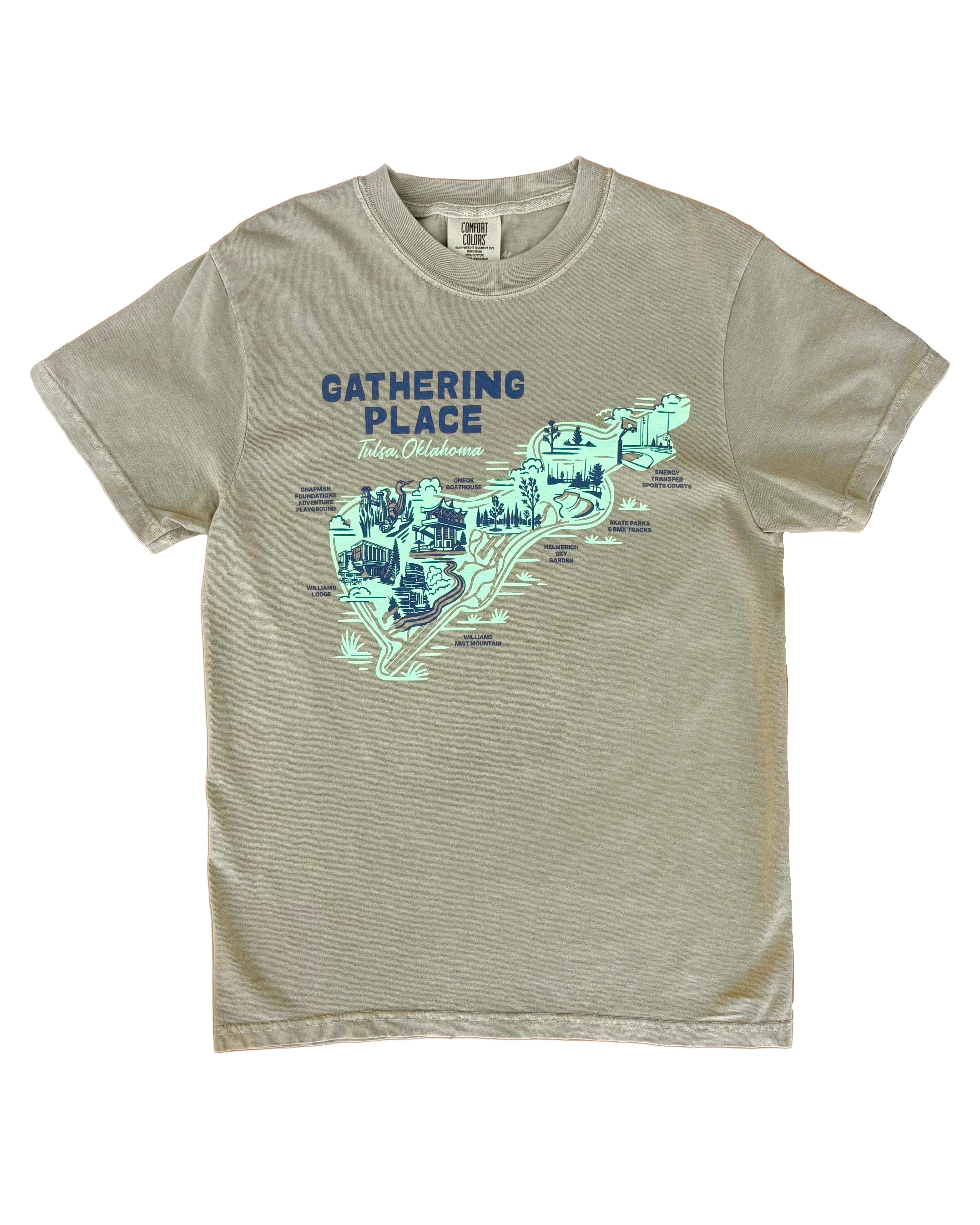 The back piece shows a close view of one of 18 graceful, concrete arches spanning the river. Art Deco details are shown in the guardrails and lights. The front piece shows the bronze sculpture titled "East Meets West", located in the adjacent Cyrus Avery Centennial Plaza. Created by Robert Summers, it depicts the Avery family riding west in a Model T encountering an east-bound horse-drawn wagon.