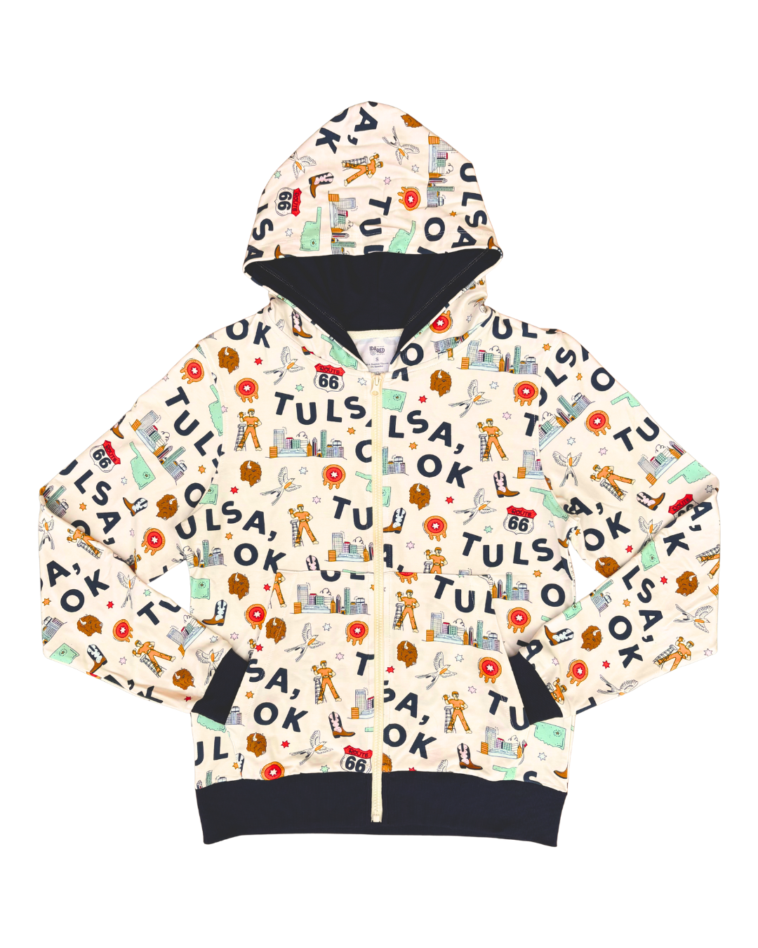 Our charming Tulsa print features all of Tulsa's greatest treasures! From our beloved flag design, to the Golden Driller, to our gorgeous city skyline, this hoodie will remind you of home every time you put it on.