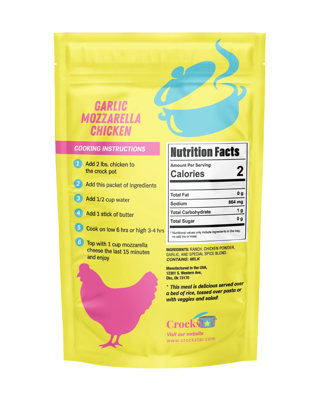 Crockstar's Garlic Mozzarella Chicken is a buttery, garlic-y, cheesy meal mix that is super tasty and flavorful. Our favorite way to eat this dish is served over a baked potato, rice, your favorite pasta or vegetable.
