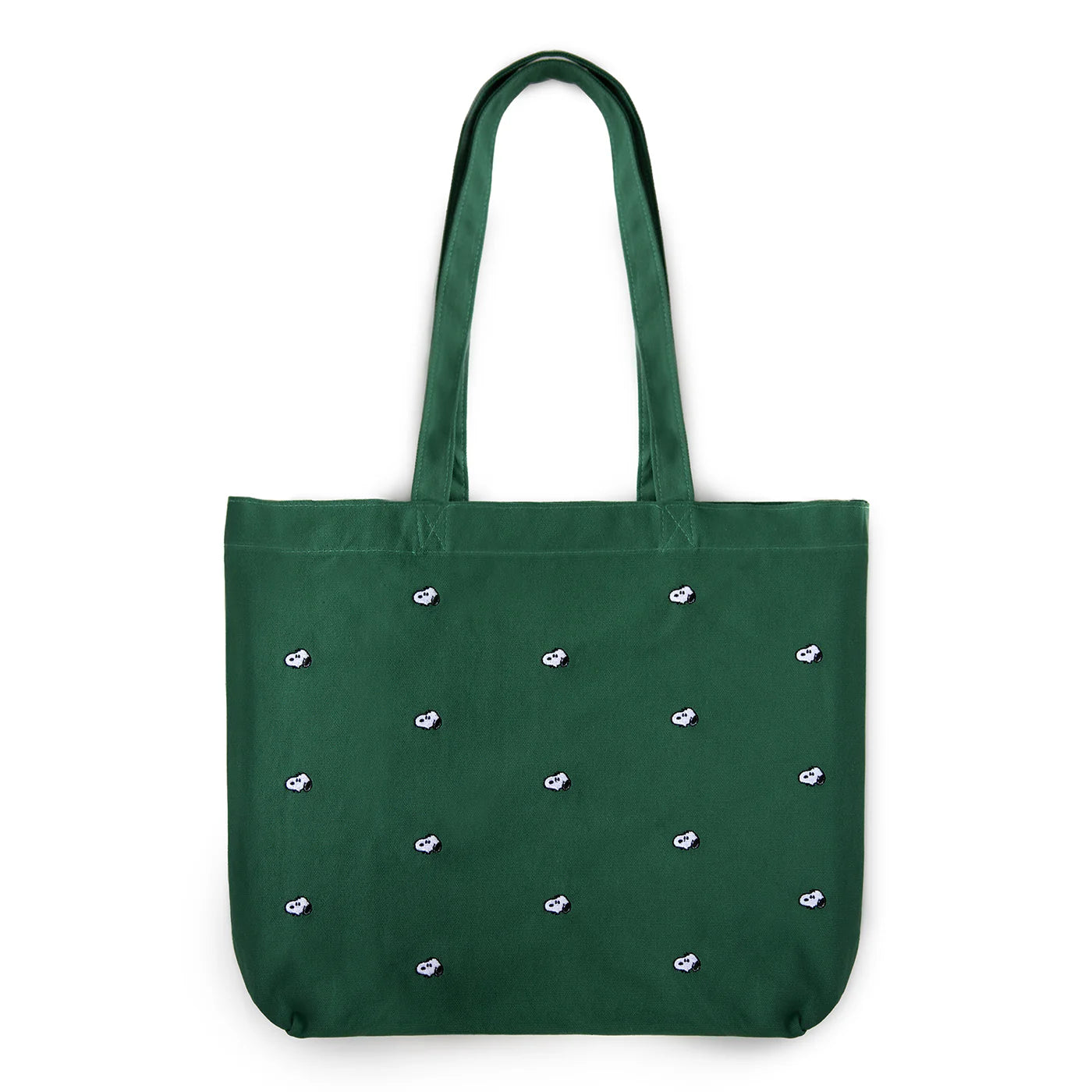 Durable cotton green canvas tote with a double sided embroidered Snoopy pattern